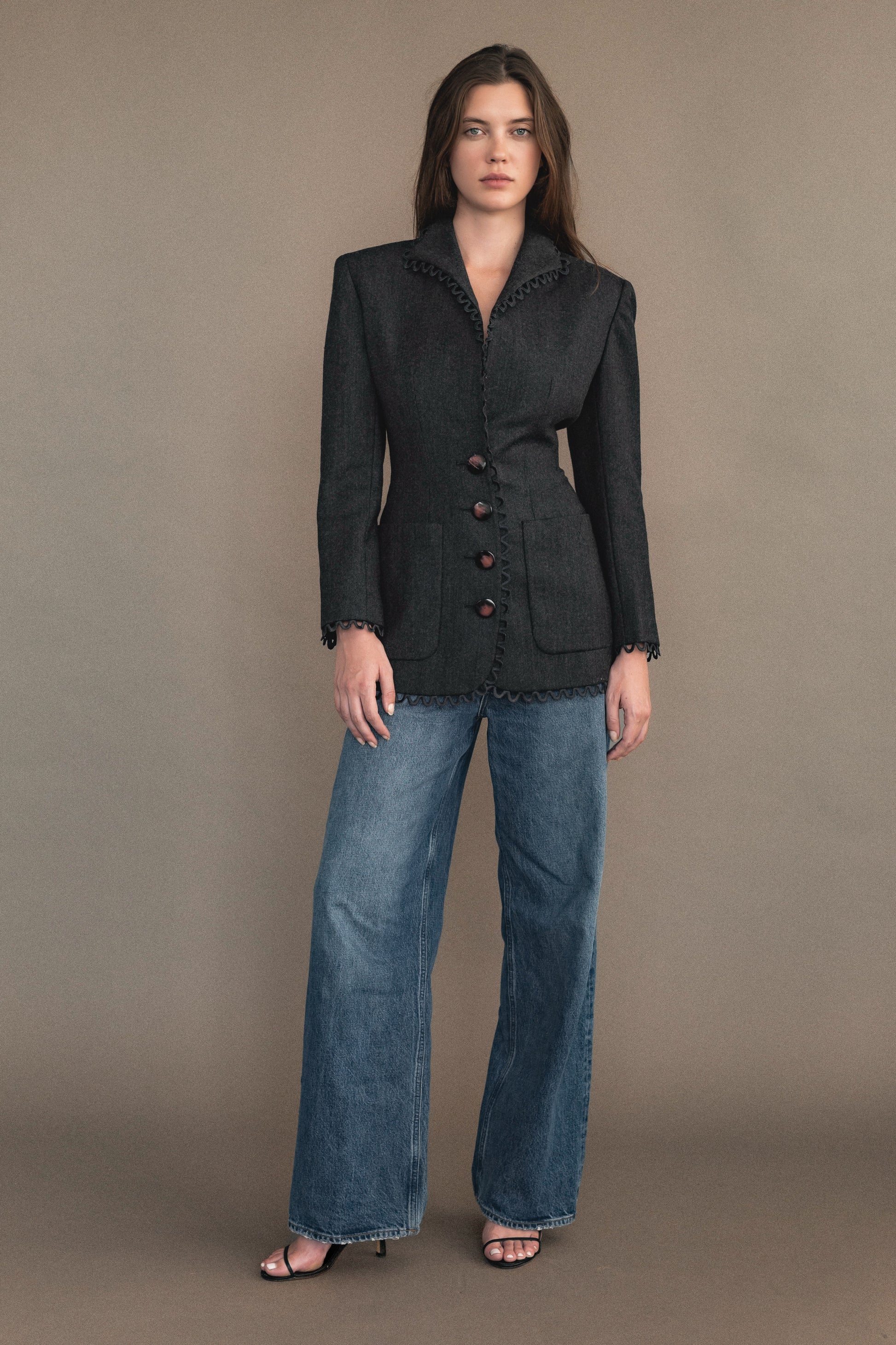 Structured grey wool blazer from 1980s Valentino. Features scalloped edging, red enamel statement buttons, and front flap pockets. A sharp, feminine take on classic tailoring from the house’s power-dressing era.