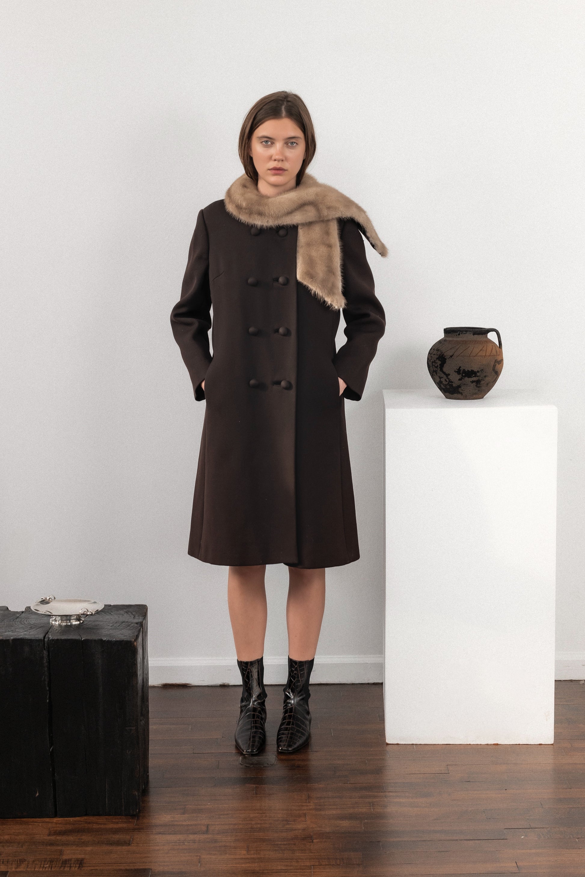 Tailored in rich brown wool with a structured, mid-length silhouette. Double-breasted button closures and discreet side pockets emphasize its classic design, while the cream fur stole collar adds a touch of elegance and warmth. Fur collar is not detachable.