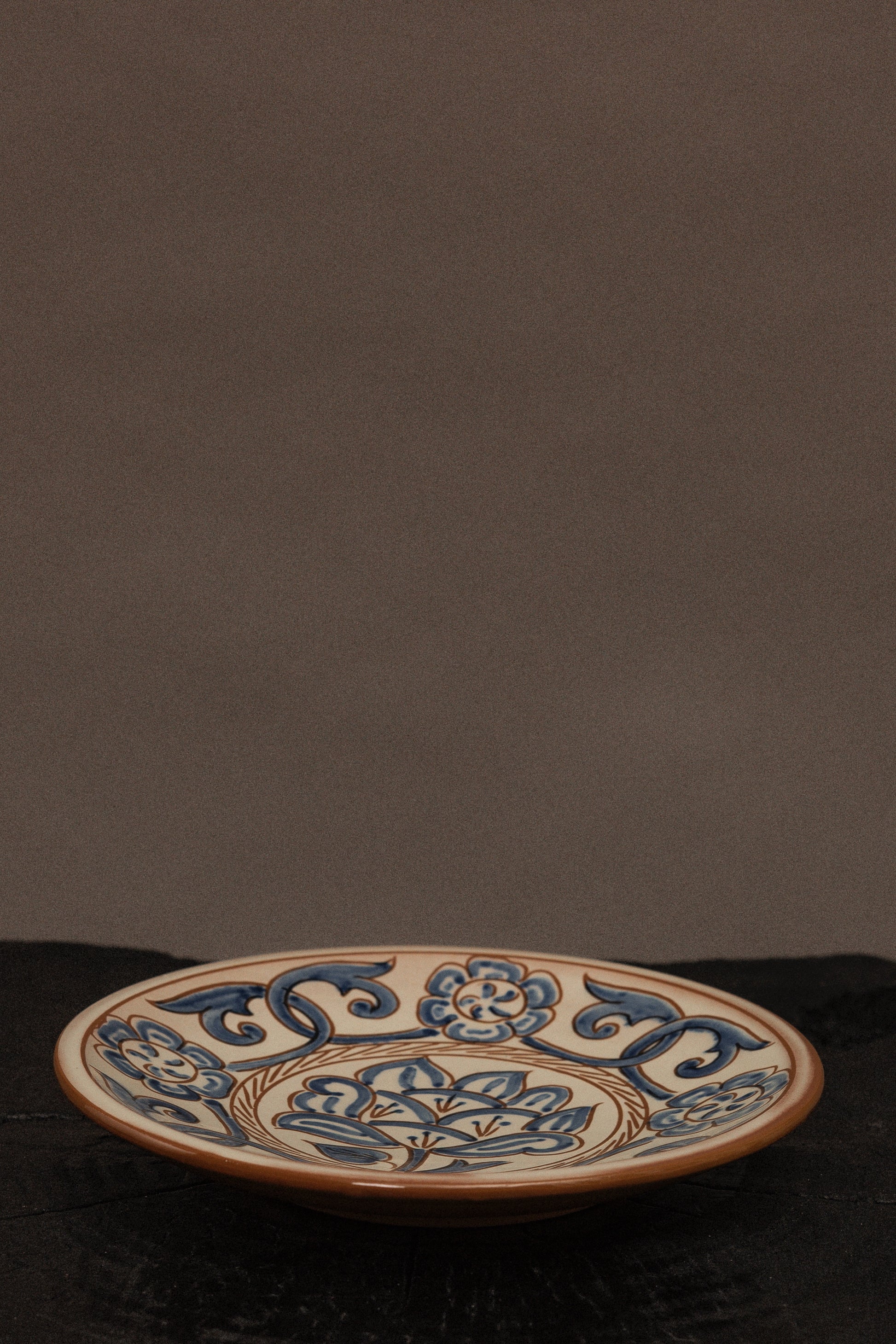 This hand-painted ceramic plate features a charming floral motif rendered in deep cobalt blue and warm terracotta tones. The design blends rustic craftsmanship with timeless elegance, evoking Mediterranean and folk art influences.