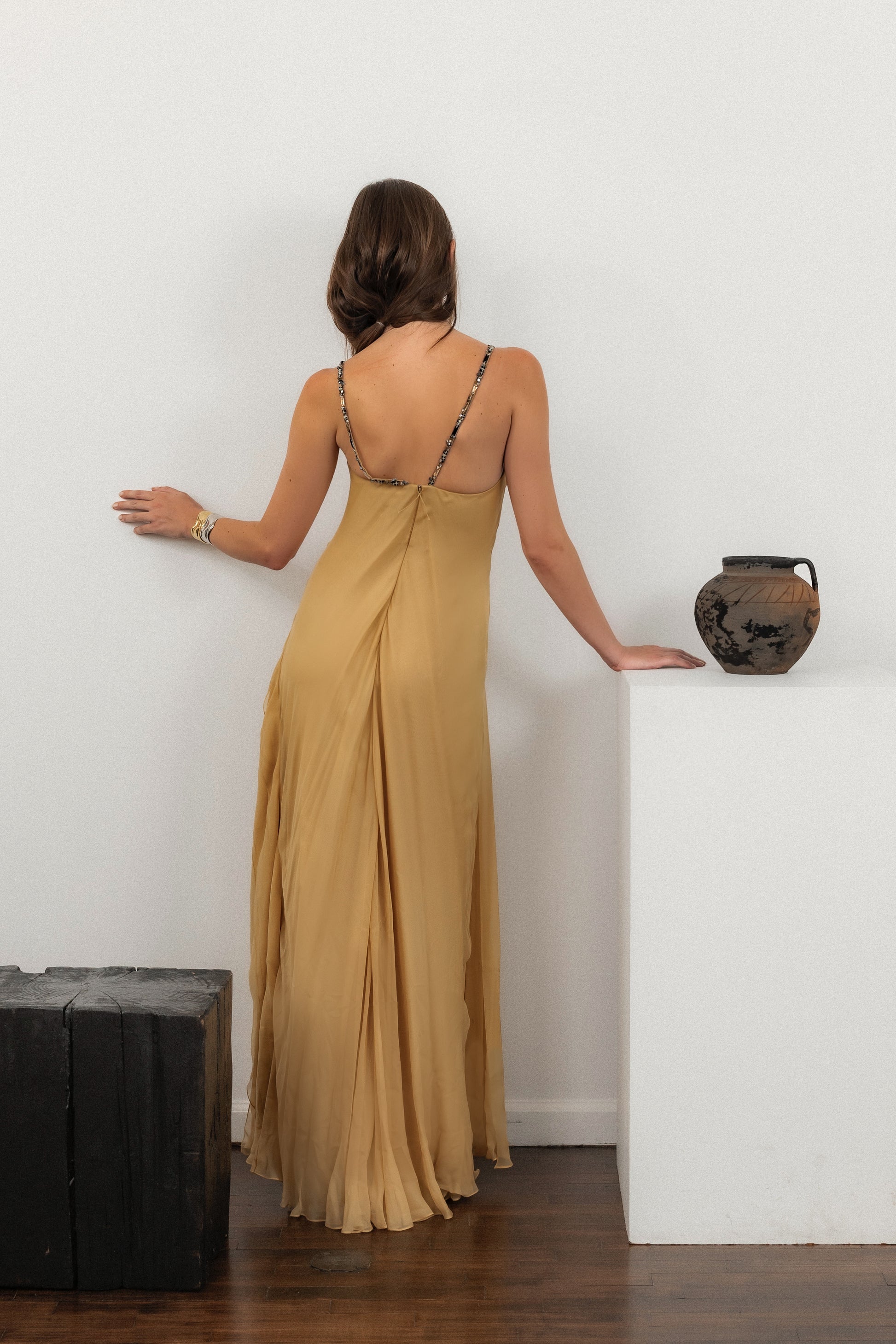 Crafted in fluid silk that shifts between warm brown and golden yellow tones, catching the light with every step. The sweetheart bodice is framed by delicate, jewel-embellished straps, and an asymmetrical cascading ruffle with flowing floor-length finish.