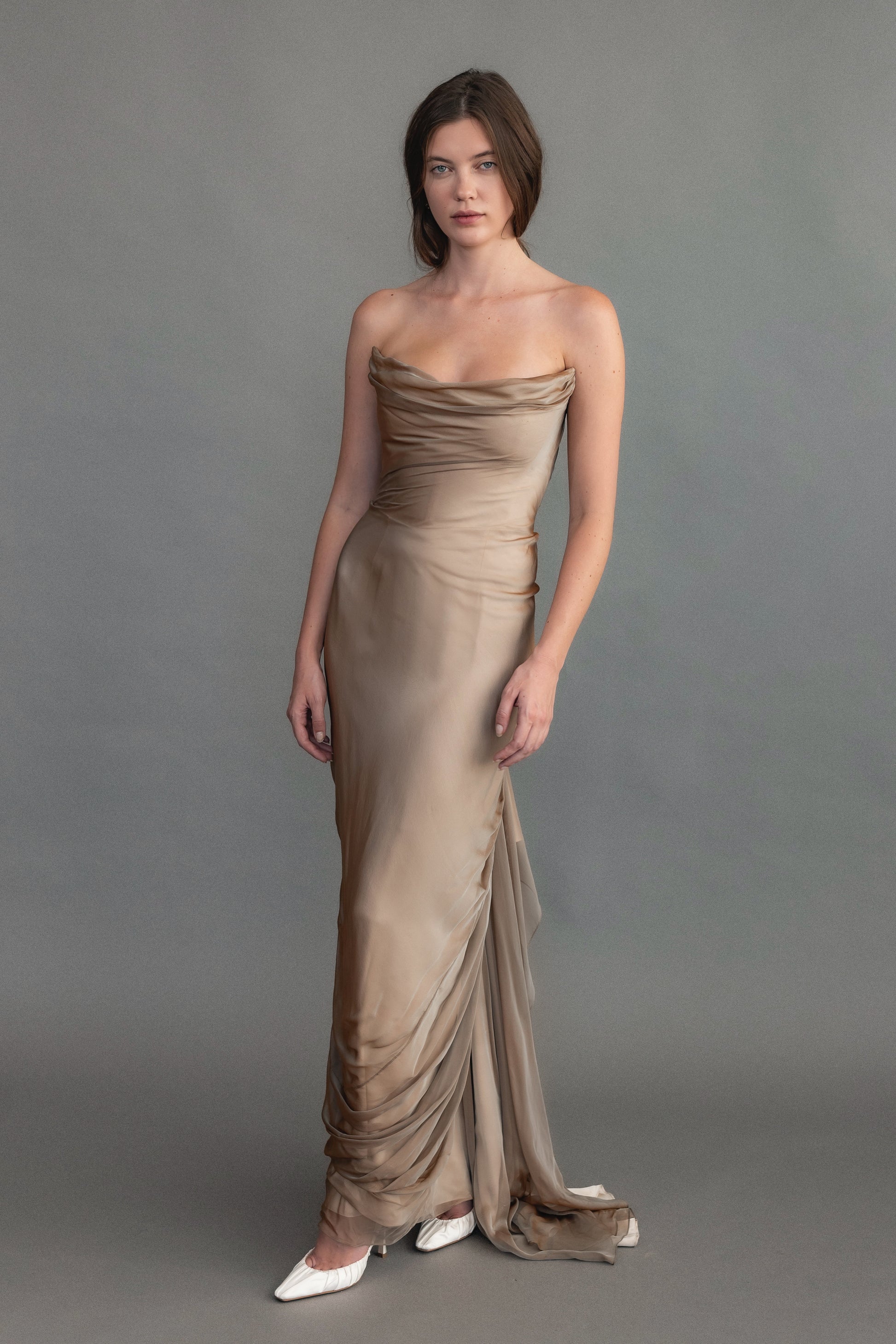 Crafted from fluid silk chiffon in soft beige with ivory accents. The bustier bodice features delicate draping that flatters the form, while the floor-length skirt extends into a trailing hemline with gathered ruching and a contrasting ivory-beige train for dramatic movement.
